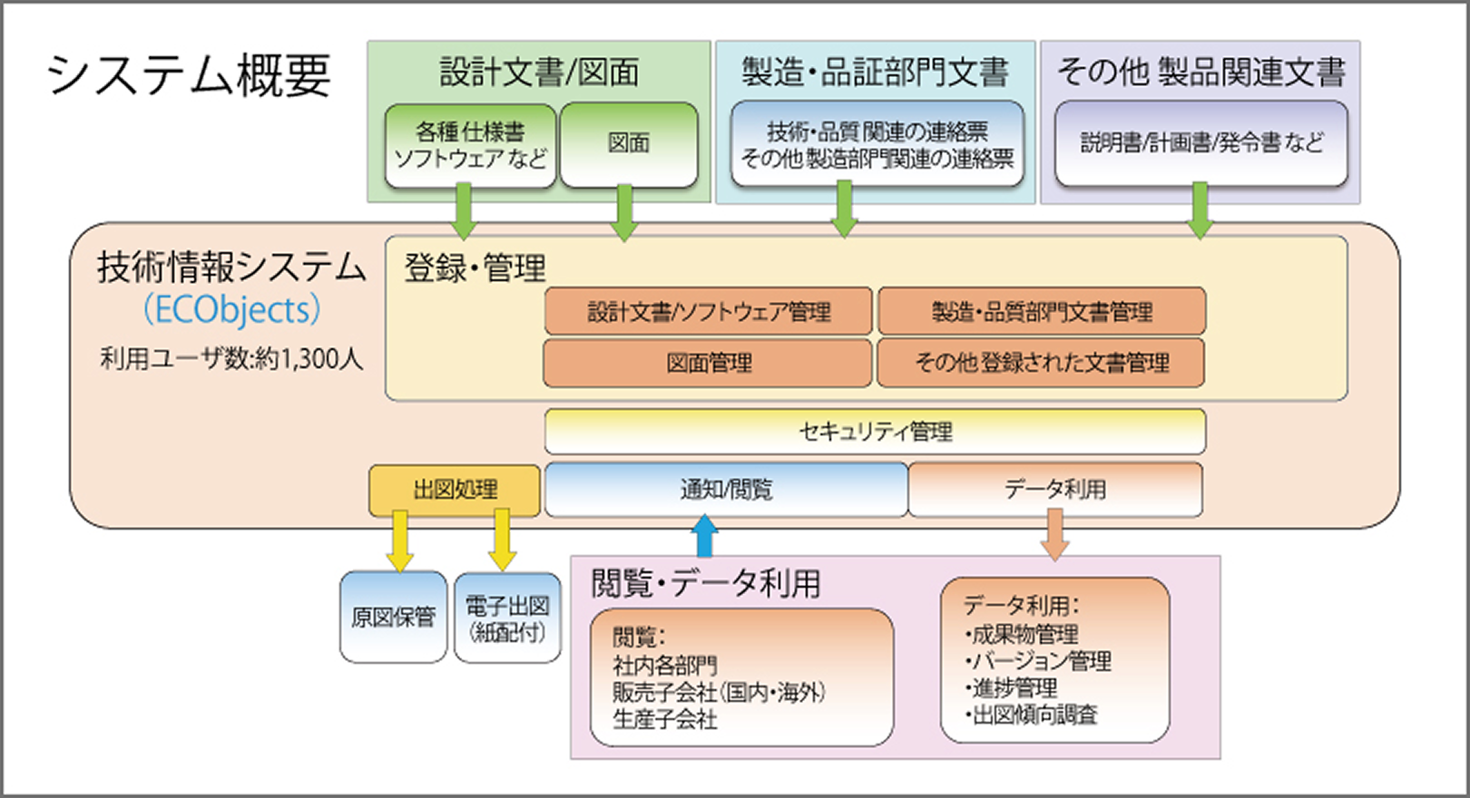 これらの課題を解決するため、「システム化により技術情報を共有し、業務を効率化する」として本格的な検討を開始し、2006年にプロジェクトを立ち上げました。スモールスタートから段階的に対象を広げてシステムを拡張することとして、まず、2008年に設計文書を中心に運用を限定してスタートしました。