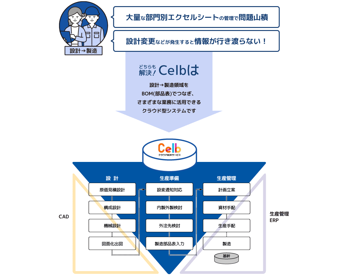 Celbは、部品情報(品番、部品仕様、図番、単価など)と、図面ドキュメント、製品構成をメンバで
