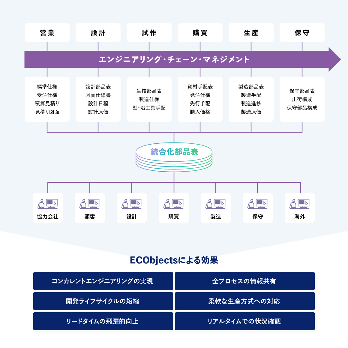 統合化部品表でモノづくり情報を一元管理することにより、部門間の情報共有をシームレスにし、すべての業務プロセスで最新の正しい情報を即座に活用することができます。