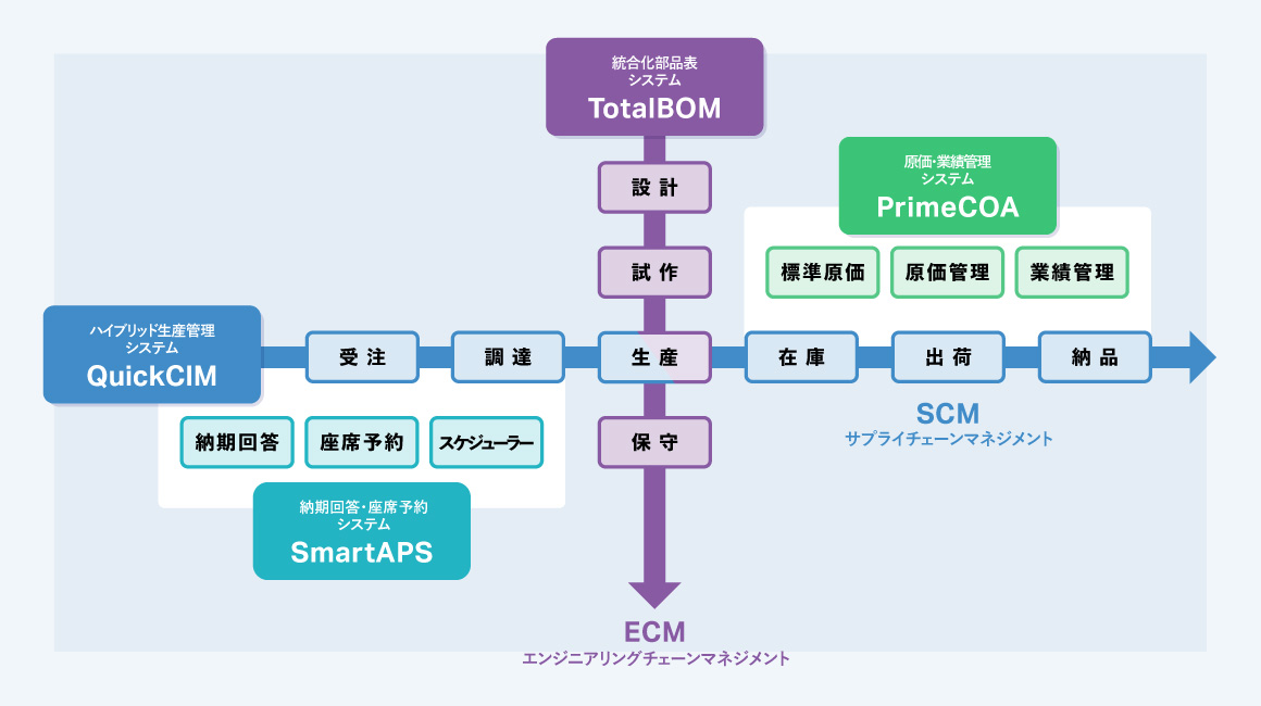 ECObjectsは、TotalBOMがECMのモノづくり情報を管理し、QuickCIMがSCMのモノの流れをカバーします。