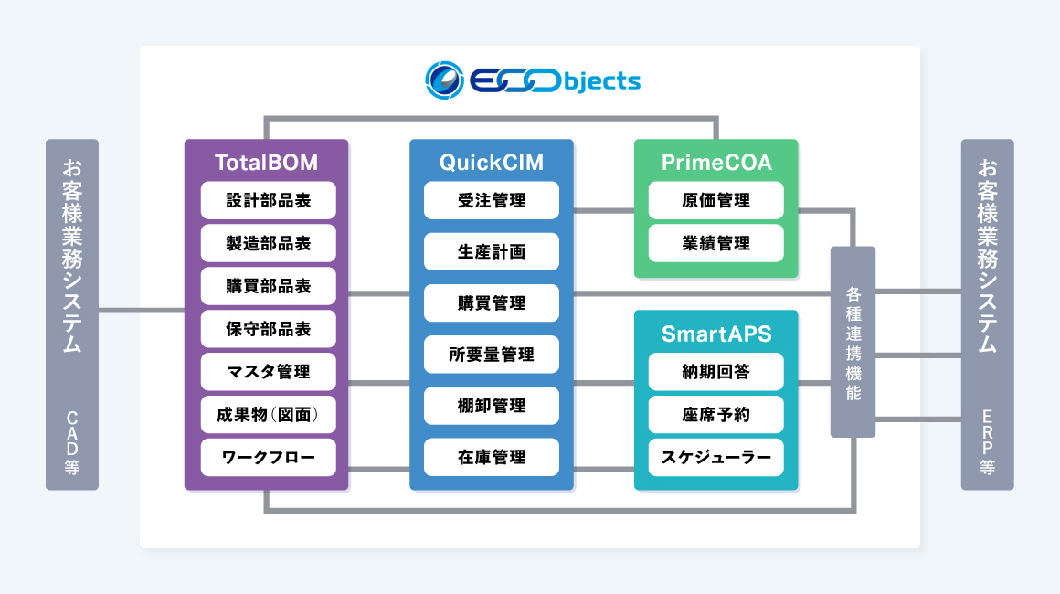 ECObjectsは、TotalBOM、QuickCIM、SmartAPS、PrimeCOAのパッケージで構成され、お客様の業務システム(CAD、ERP、EDI、MESなど)との各種連携が可能です。