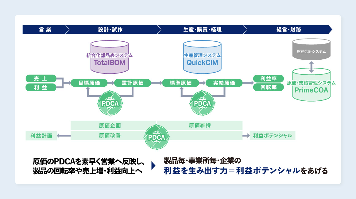 これからの時代を生き抜くためには設計、生産、経理部門が三位一体となって活動し、原価の企画、維持、改善といったPDCAサイクルを回し、営業部門へ反映することで、製品の回転率や売上・利益を向上することが重要となります。