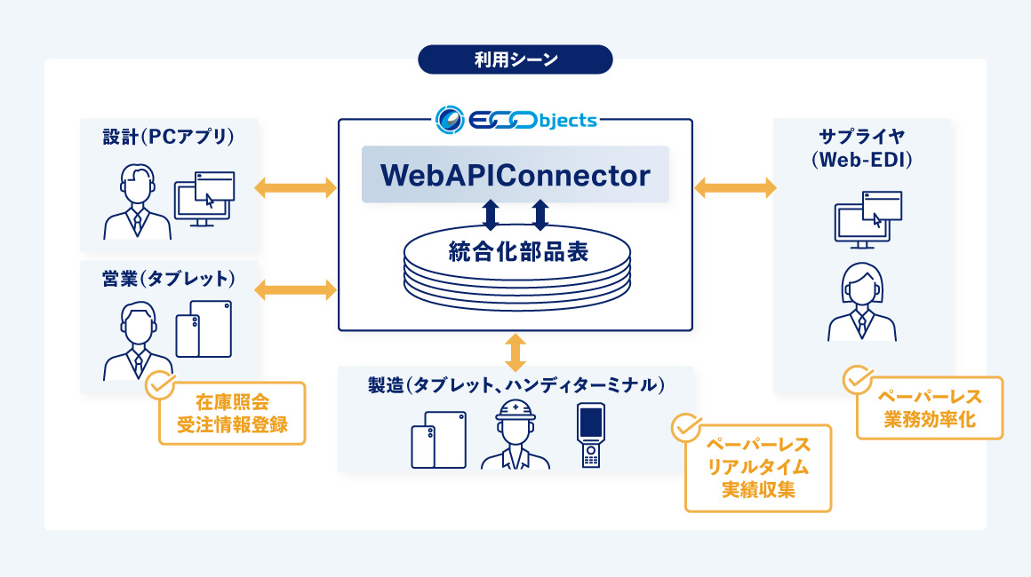 社内での設計業務だけでなく、外出先からの在庫照会、製造現場からの実績データ収集や、サプライヤとのWeb-EDIなど、統合化部品表を活用した業務改善がよりいっそう進みます。
